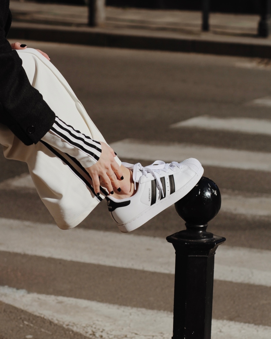 Volim kada je outfit čist. Bela i crna. Jasne linije. Kontrast koji ne mora da se objašnjava. Zato sam ih kombinovala sa širokim pantalonama i oversized blejzerom. Sport × struktura. Street × polish. Taj balans mi je bitan. SuperStar su deo tog balansa.