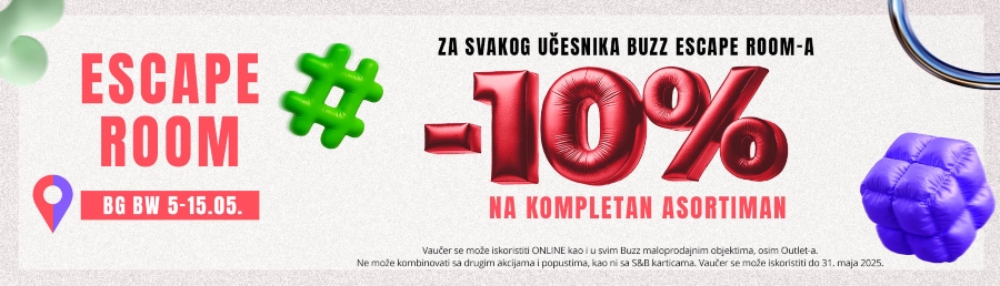 Za sve one koji se u ovih deset dana rođendanskog slavlja nađu u TC Galerija, na trgu kod Crne Ovce (prvi sprat), pripremili smo poseban izazov. Buzz Escape Room koji će biti otvoren od 5. do 15. maja, od 12h do 22h. Potrebno je samo da okupiš ekipu (2-3 učesnika) i povedeš ih u nezaboravnu avanturu. Svakog dana, ekipa koja za najkraće vreme pronađe izlaz iz Escape Room-a osvaja vaučer za kupovinu u Buzz-u u vrednosti od 30.000 RSD.