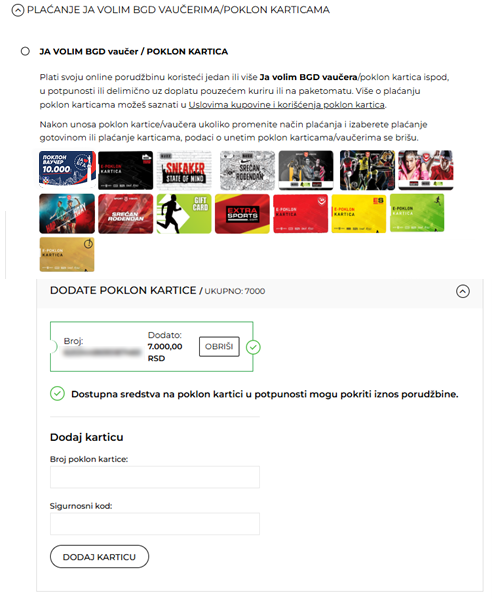 Napomena: Nakon unosa poklon kartice/vaučera ukoliko promenite način plaćanja i izaberete plaćanje pouzećem ili plaćanje karticama, podaci o unetim poklon karticama/vaučerima se brišu.