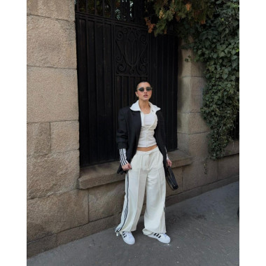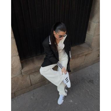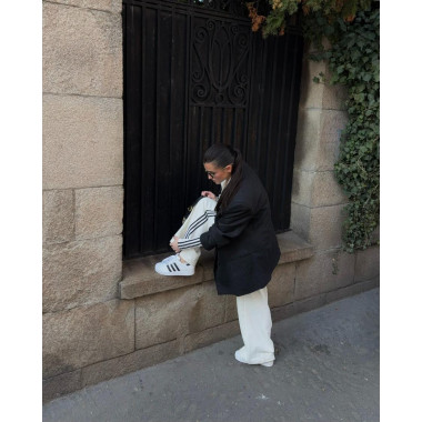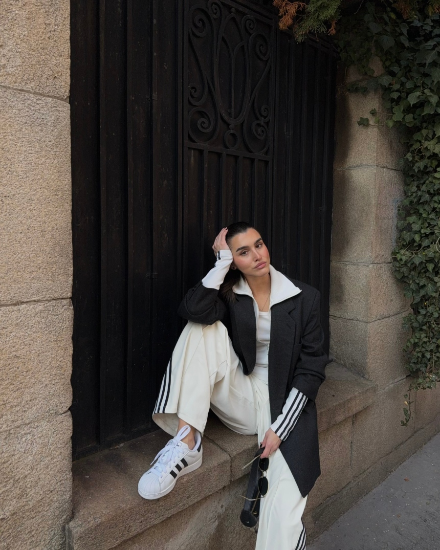 Volim kada je outfit čist. Bela i crna. Jasne linije. Kontrast koji ne mora da se objašnjava. Zato sam ih kombinovala sa širokim pantalonama i oversized blejzerom. Sport × struktura. Street × polish. Taj balans mi je bitan. SuperStar su deo tog balansa.