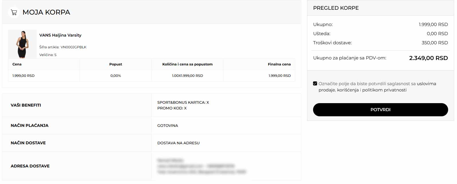 Nakon unosa podataka, potrebno je da pređete na sledeći korak gde možete videti pregled korpe i potvrditi porudžbinu (Slika 8).